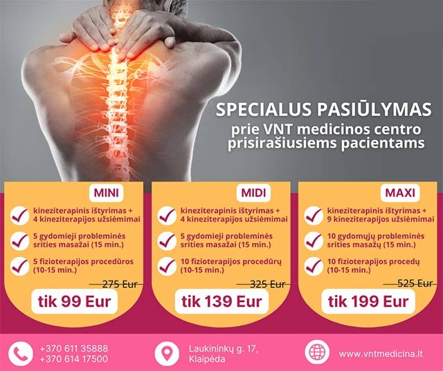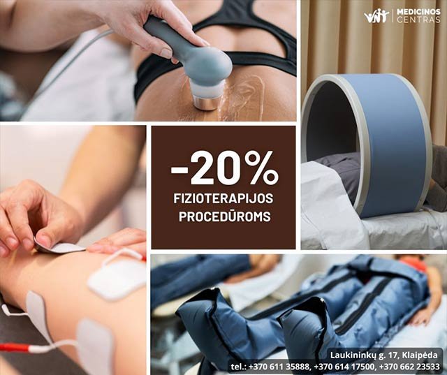 Fizioterapijos procedūros padeda mažinti skausmą, gerinti judrumą ir palaikyti organizmo atsistatymą. Tai veiksminga kompleksinės priežiūros dalis tiems, kurie nori stiprinti sveikatą, lengvinti kasdienį diskomfortą ir greičiau grįžti prie aktyvesnio gyvenimo. Visiems pacientams fizioterapijos paslaugoms taikoma 20 % nuolaida.