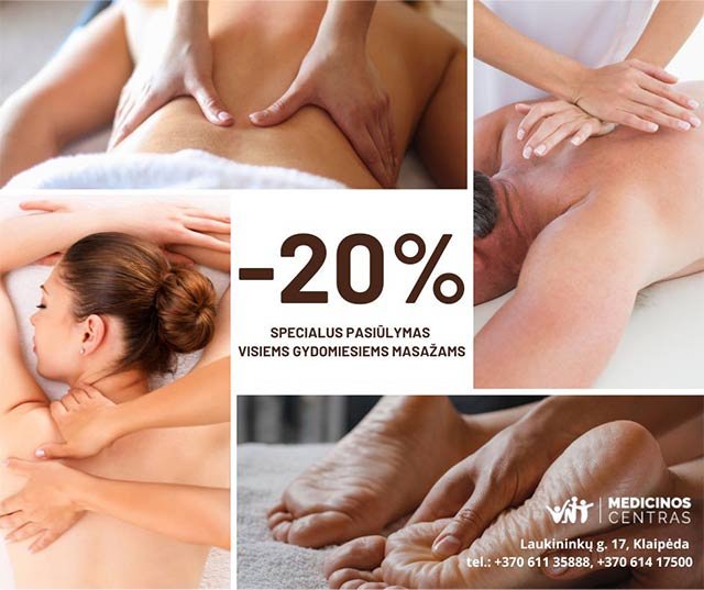 Gydomasis masažas padeda sumažinti raumenų įtampą, gerinti kraujotaką ir atkurti geresnę savijautą. Tai puikus pasirinkimas norint atsipalaiduoti, sumažinti fizinį diskomfortą ir pasirūpinti savo kūnu po didesnio krūvio ar įtampos. Visiems pacientams gydomojo masažo paslaugoms taikoma 20 % nuolaida.